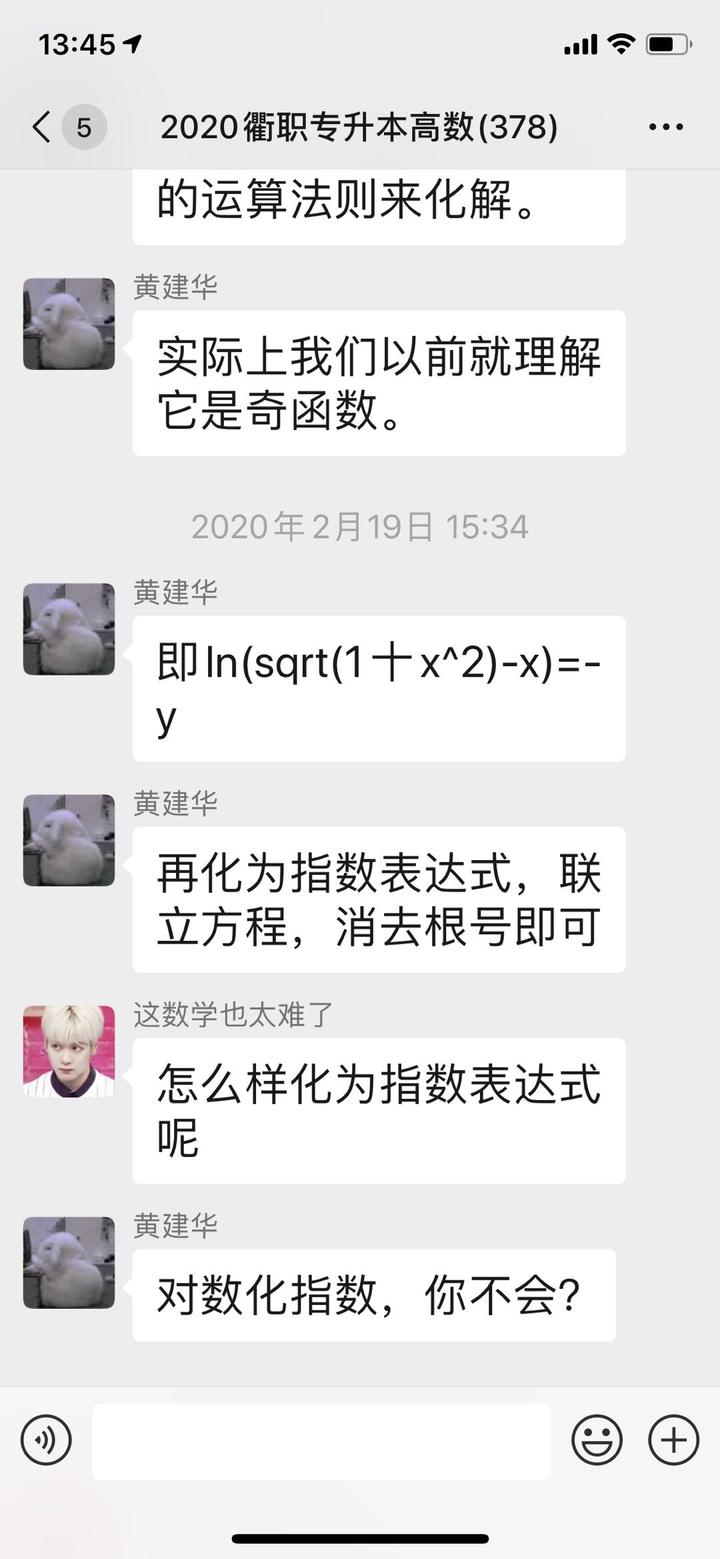 “专升本是许多衢职学子梦寐以求的心愿,4月份的统招专升本考试是他们唯一一次将第一学历改写为本科的机会,今年受到疫情影响,回校后面对面授课的时间还不能确定,但是目前没收到专升本考试推迟的消息,这个关键的复习阶段,一定要给他们做好知识保障。”黄老师说,学生们的问题经常较多较细较杂,很多时候要先帮他们补上相关知识点再解答问题,甚至很多问题可能十几分钟前刚回复过,又被其他问题刷新群消息,后面的同学再问一次,黄老师依然耐心地再次解答。微信解答没法达到课堂上边讲解边演算的效果,稍微复杂一些的问题,黄老师手写解题过程,然后拍照回复,他一个步骤也没省,旁边还标注好每一步用到的知识点,作为上下两步变形变换的依据,这样一来,就算不是特别复杂的问题,常常也是满满一页A4纸的解题过程,学生看完直呼清楚明了。为了不刷屏,尽可能的让其他同学也看到有关问题的答疑,那些稍微简单的问题,黄老师就通过键盘打出那些含有大小写字母、上下角标的复杂数学符号,对于一个上了年纪的人,这却不是一件容易的事。“好几个知识点老是记不住,黄老师说那是因为没有透彻理解来龙去脉,不知其所以然。所以他特意去给我在百度上找了解答发给我,动态图那种,看完以后豁然开朗,还便于记忆。”17中药1班朱莱蒙说。黄老师为了某几个问题,花了些功夫上网找这样图文并茂的链接,他手机里还存了几个相关知识点的网页,他说,可能后期还会有同学需要,存着备用。