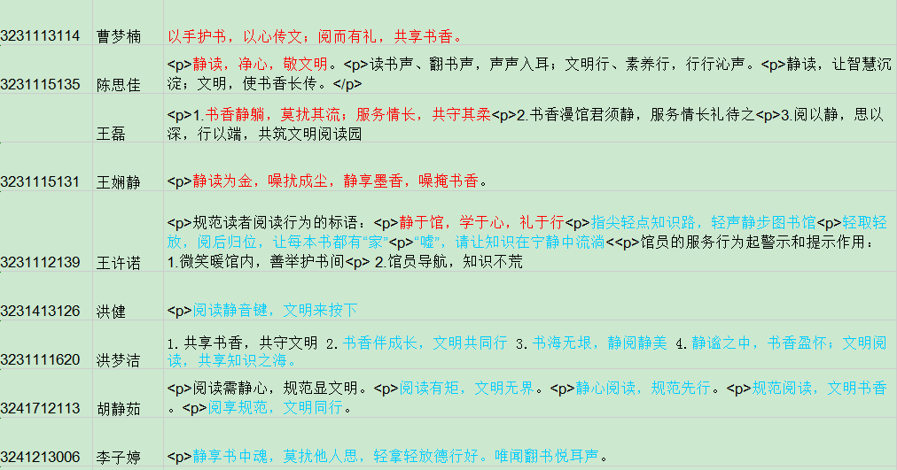 为营造更加文明、和谐的阅读环境,近日,图书馆举办了一场别开生面的文明阅读标语线上评选活动。此次活动吸引了全校270余名学生的积极参与,围绕“规范读者阅读行为和馆员服务行为”创作出大量的评语,不仅展现了学生们的创意与才华,更为图书馆的期末复习氛围增添了一抹亮色。