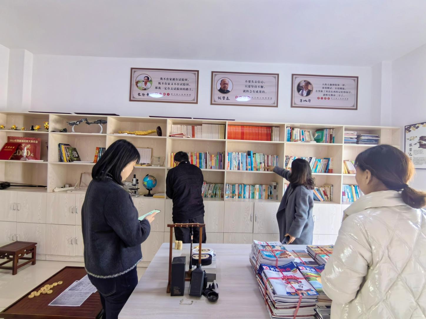 调研小组对金山村阅驿站的藏书进行了系统化盘点,该驿站内图书种类丰富,涵盖农业技术、文学经典、少儿读物及党建理论等多个领域,书架陈列整齐有序,阅读环境温馨舒适。馆员们逐一核对书目信息,并对书籍流通数据进行分析,为后续资源补充与调配提供科学依据。